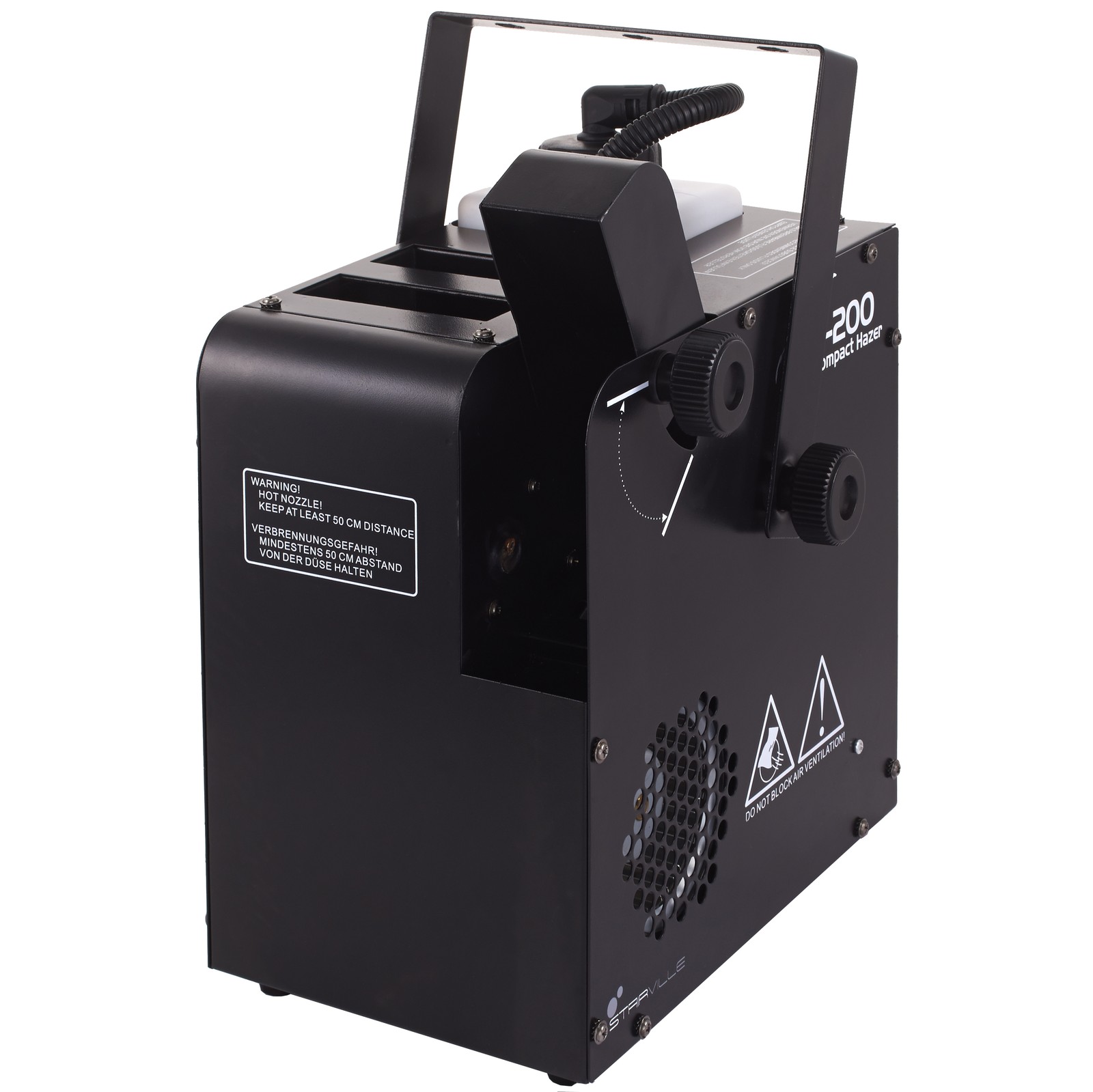 El Stairville Hz-200 Compact Hazer DMX genera una neblina prácticamente invisible en la que los efectos de luz se hacen más efectivos. El elemento calentador tiene una potencia de 615 vatios. Tan solo en cerca de un minuto y medio, el dispositivo está listo para usar. Un Hazer crea un efecto que se va haciendo más visible gradualmente según se va dispersando el fluido atomizado en el aire de la estancia. Este generador de neblina pesa 7,5kg y mide 280 x 330 x 380mm incluyendo el cuello de llenado y el arco de sujeción. El tanque tiene capacidad para 1,2 litros de líquido. El fluido adecuado se encuentra disponible por separado. El Stairville Hz200 Compact Hazer DMX se puede controlar a través de DMX, con los interruptores DIP que incorpora, o con el control remoto por cable. Este viene incluido en el material suministrado. La posición del décimo interruptor DIP es importante. Si se usa la unidad de interruptores DIP, debe configurarse en "On", mientras que en los otros dos modos de funcionamiento debe estar en "Off".